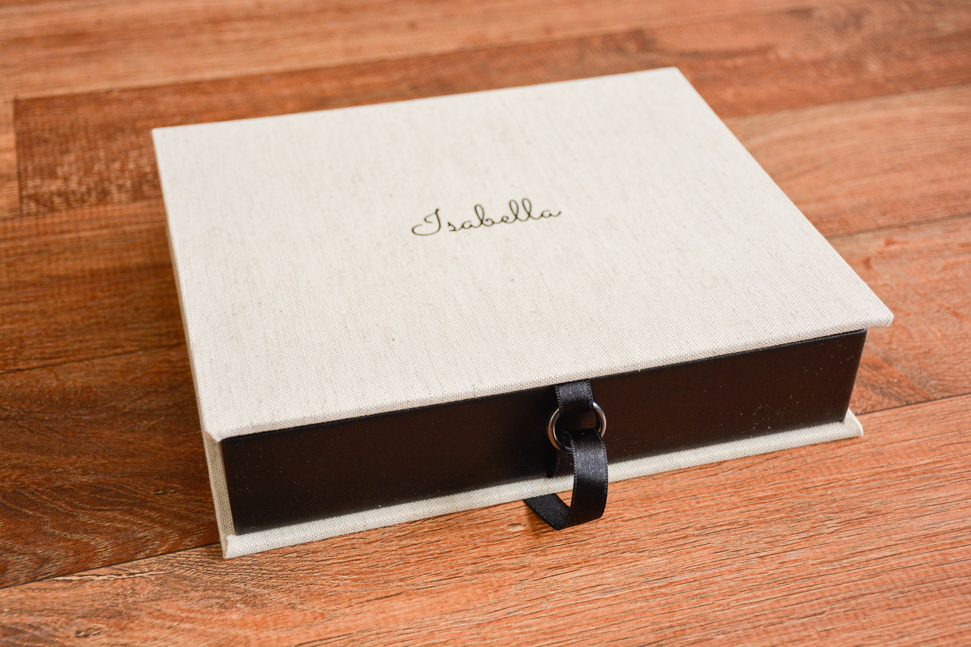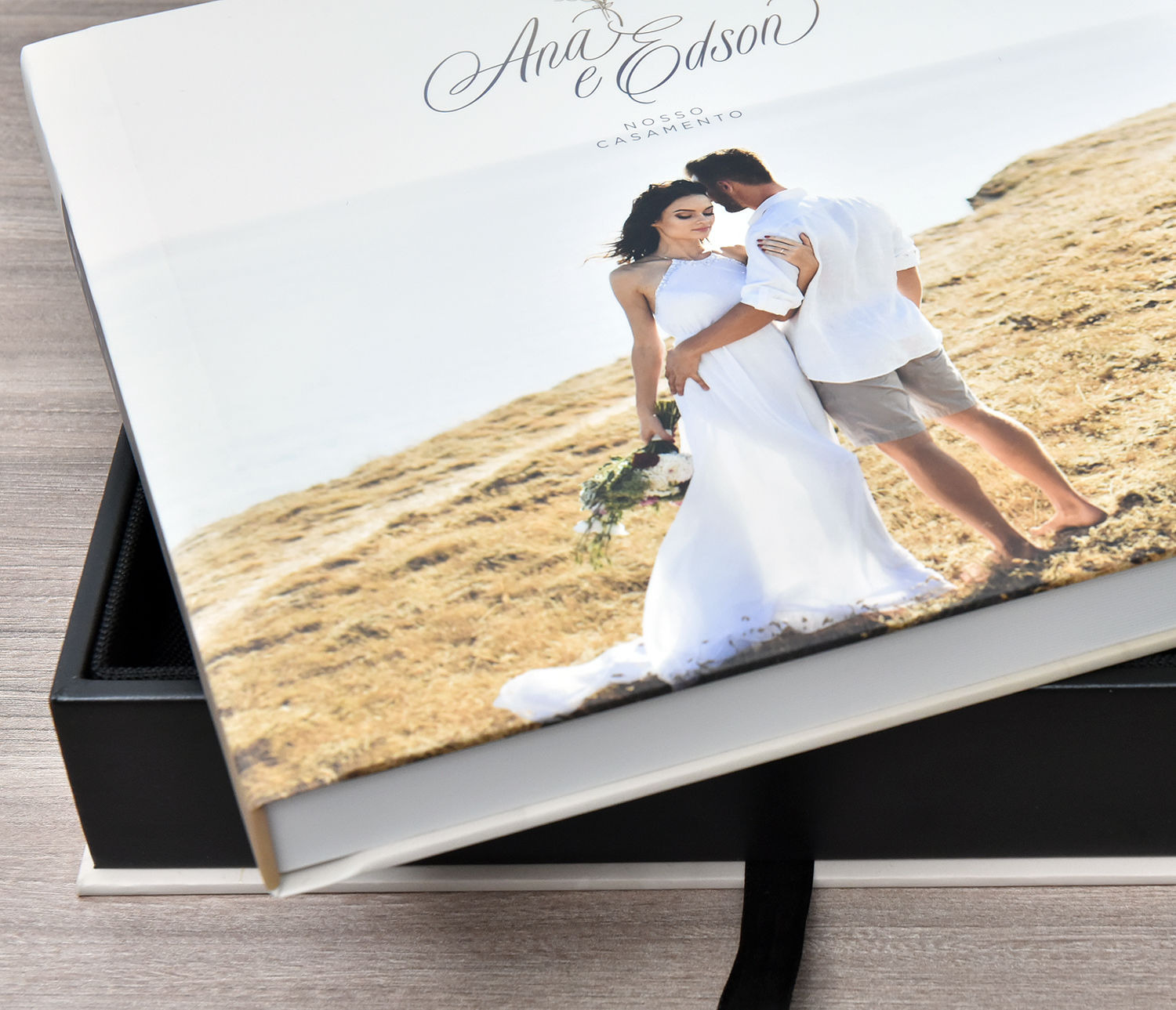 Seu álbum ficará protegido por um lindo box revestido em tecido, com uma gravação a laser personalizada, que poderá ser um nome ou uma frase especial.