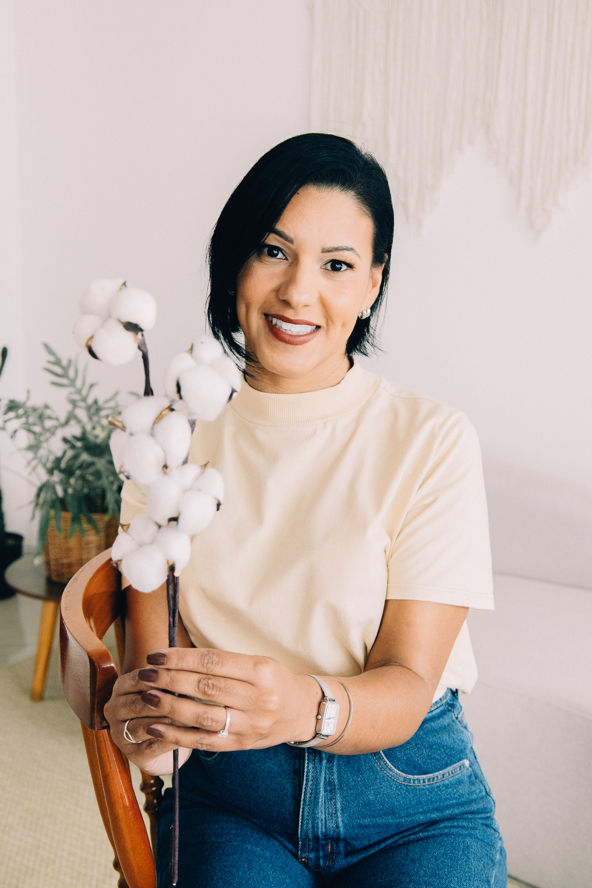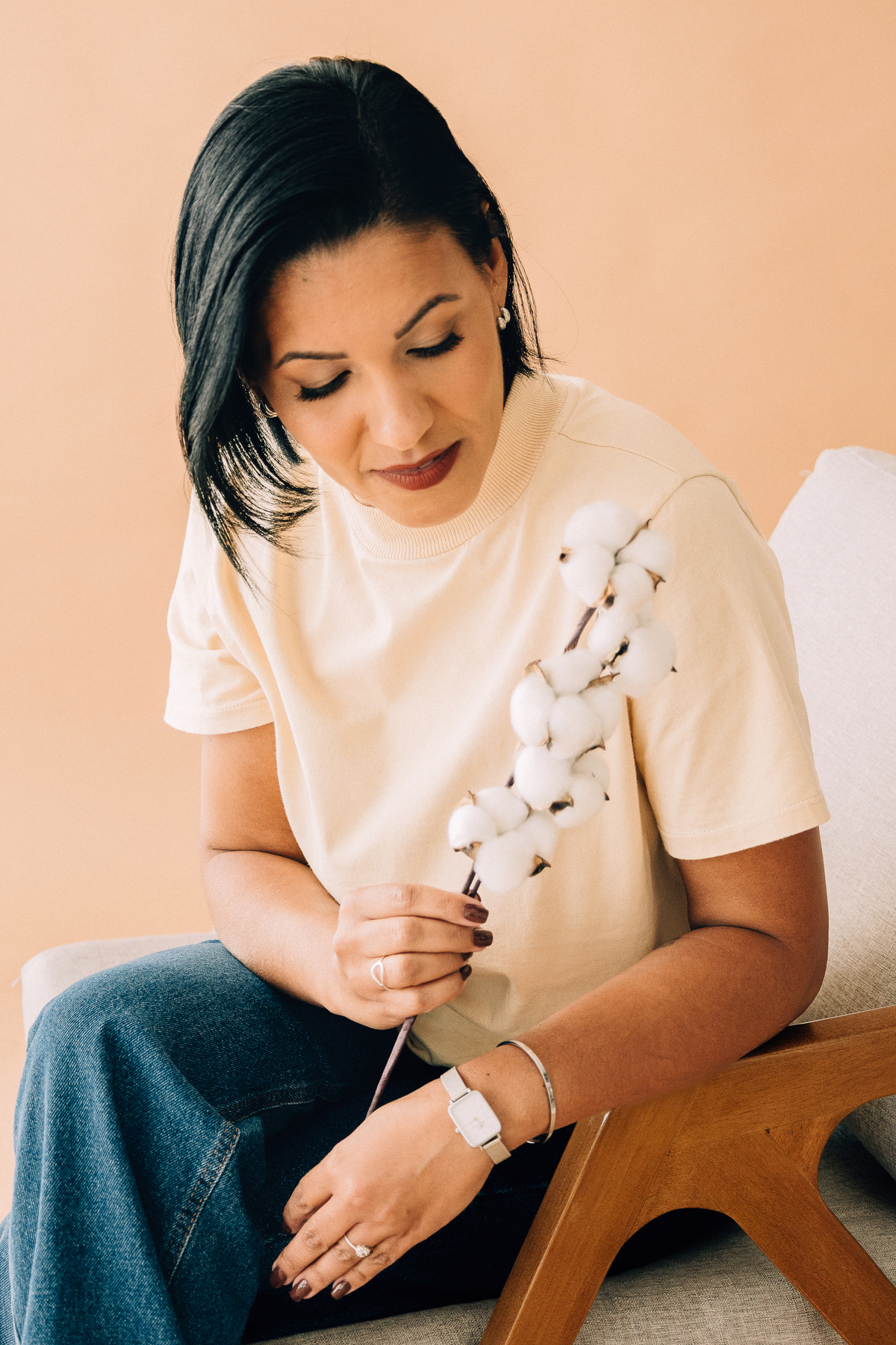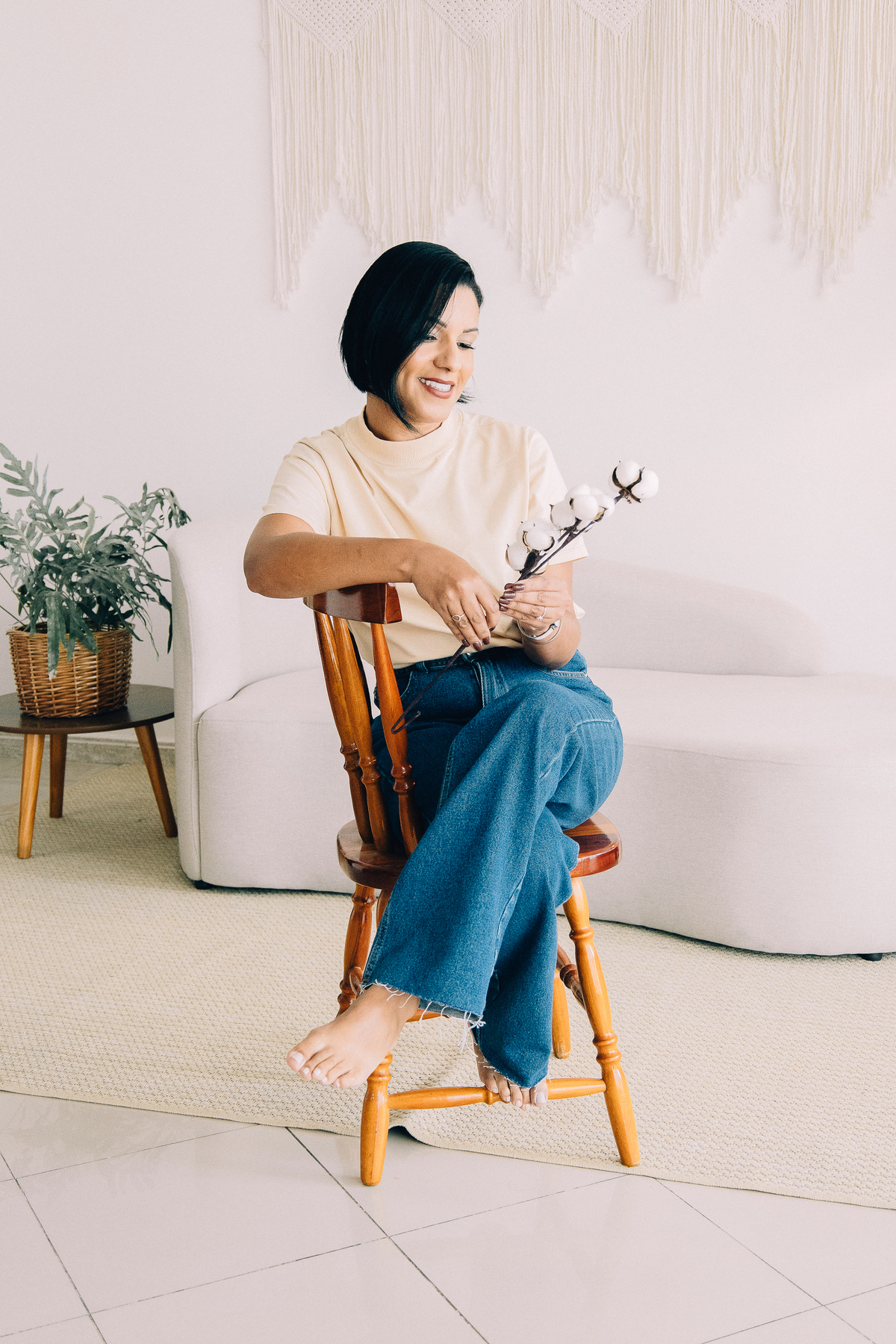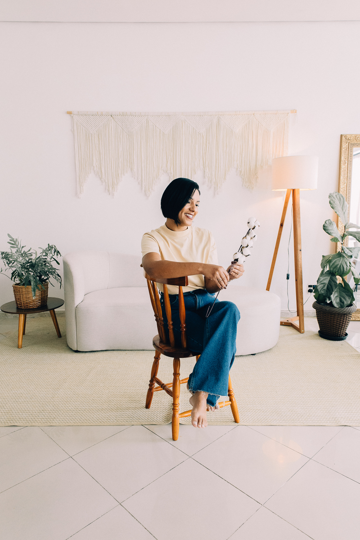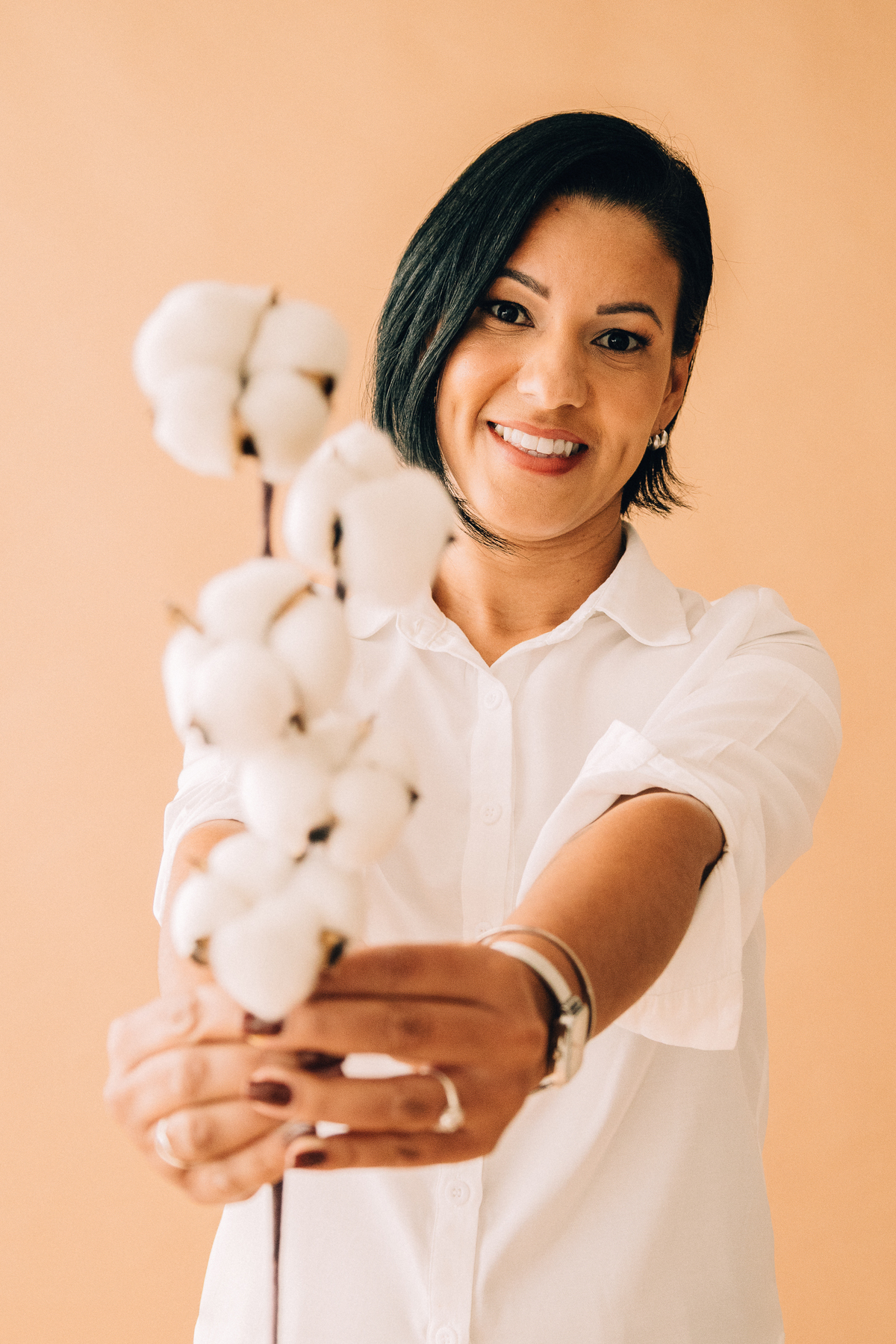 Ela queria um ensaio leve, sensível, com os elementos que fazem parte do seu dia a dia: o avental, os moldes, as fitas e os potes coloridos de tinta que espalham criatividade. Mas também queria que a doçura e a firmeza da sua personalidade estivessem ali, visíveis em cada imagem. E foi nesse desejo que surgiu um detalhe marcante: um galho de algodão que ela fez questão de trazer para o ensaio. Um símbolo simples, mas carregado de sentido — remetendo à sua escolha por um caminho sustentável, delicado e cheio de intenção.