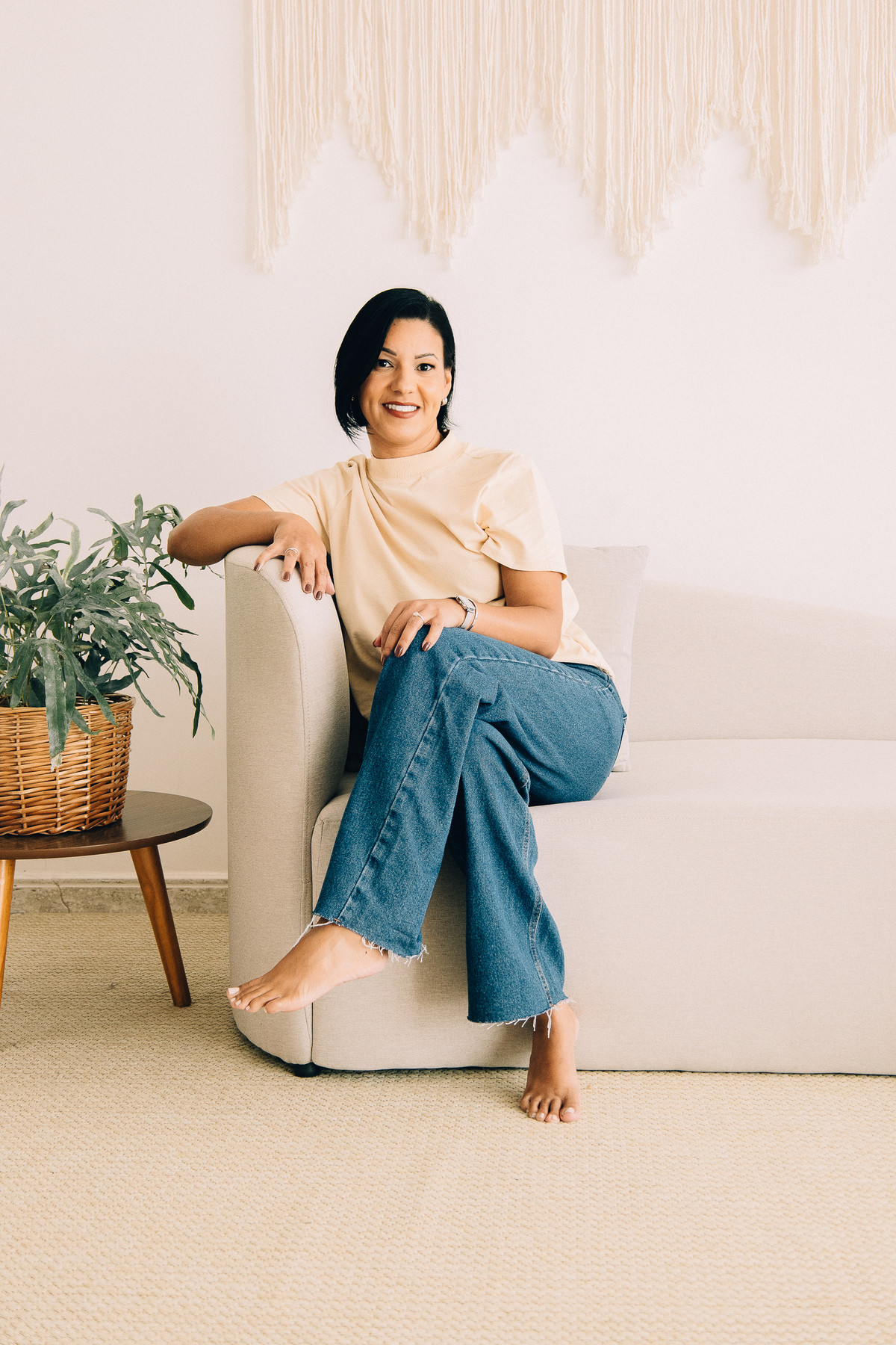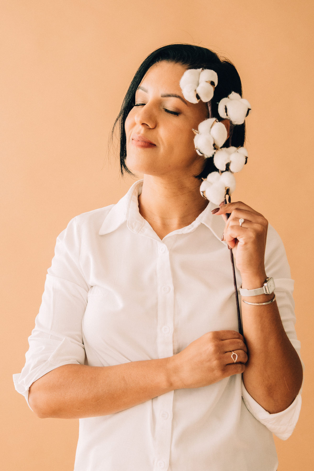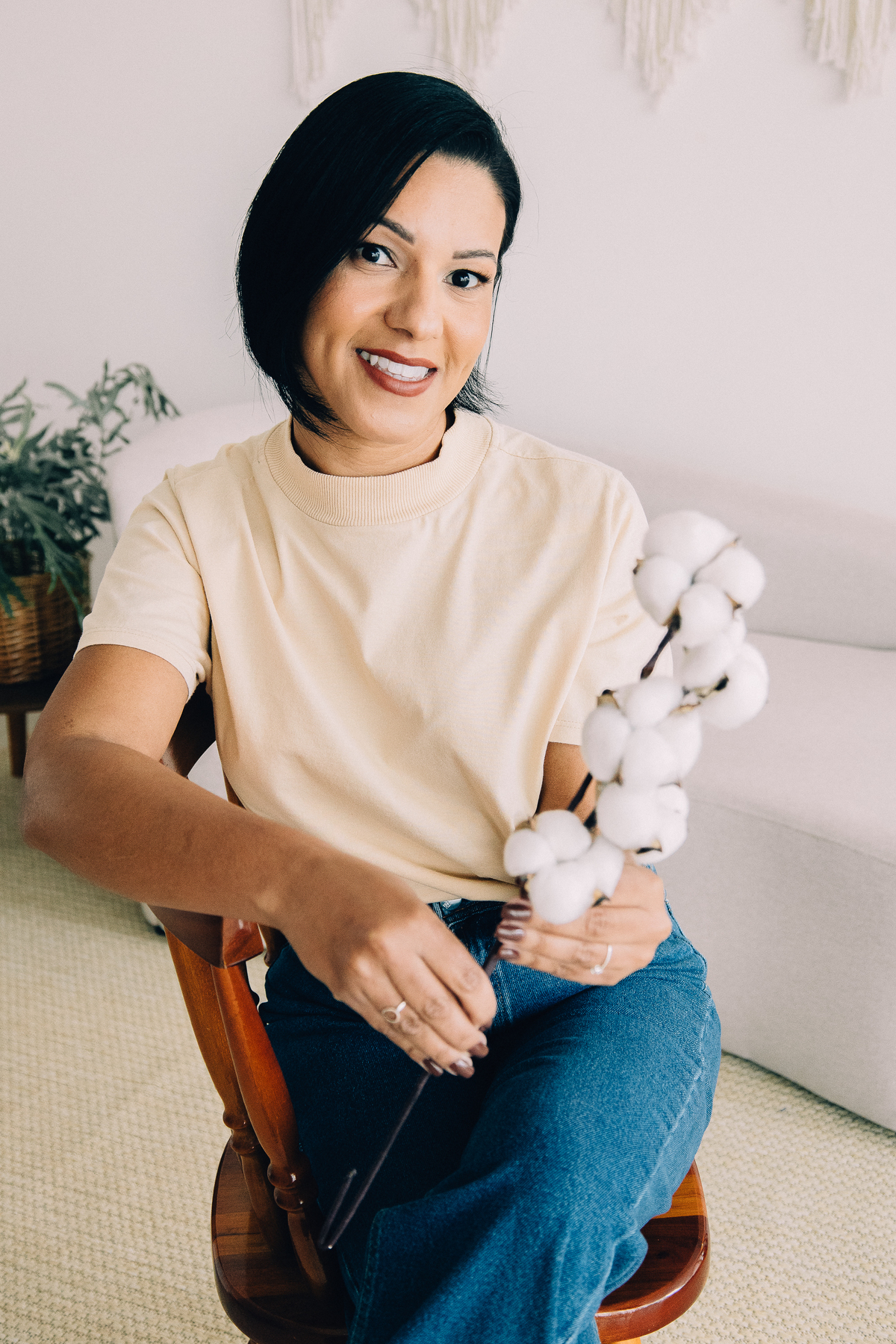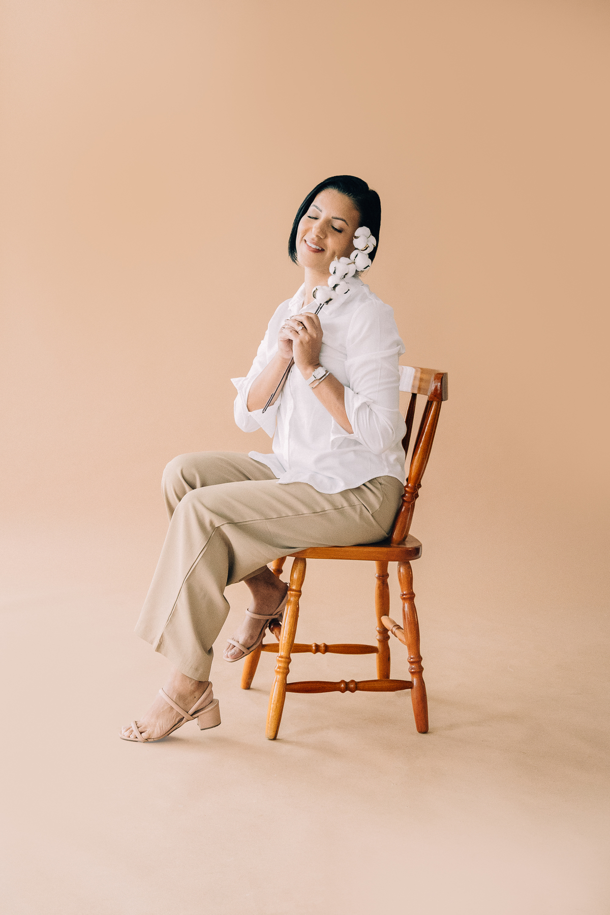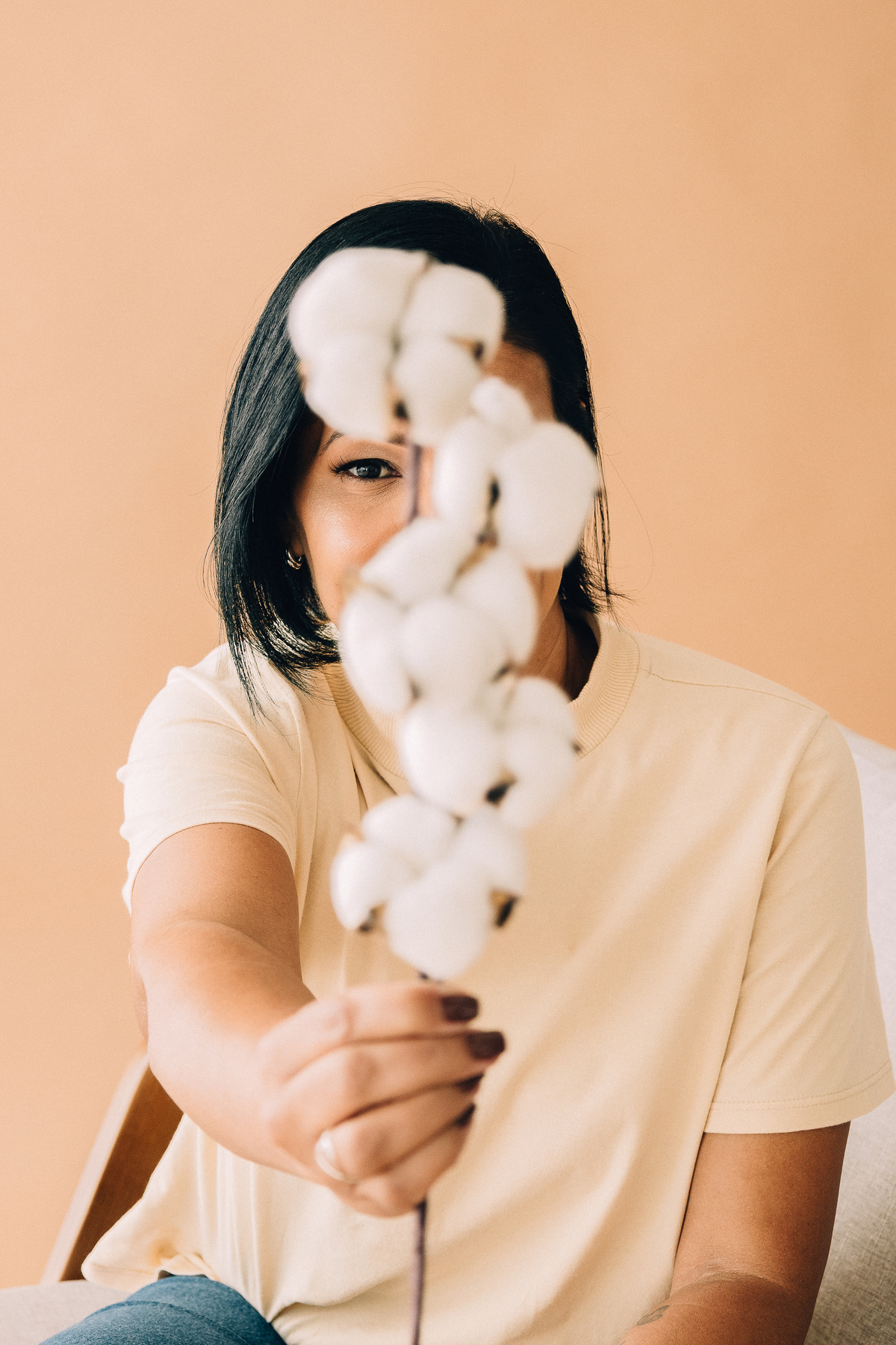 Ela queria um ensaio leve, sensível, com os elementos que fazem parte do seu dia a dia: o avental, os moldes, as fitas e os potes coloridos de tinta que espalham criatividade. Mas também queria que a doçura e a firmeza da sua personalidade estivessem ali, visíveis em cada imagem. E foi nesse desejo que surgiu um detalhe marcante: um galho de algodão que ela fez questão de trazer para o ensaio. Um símbolo simples, mas carregado de sentido — remetendo à sua escolha por um caminho sustentável, delicado e cheio de intenção.