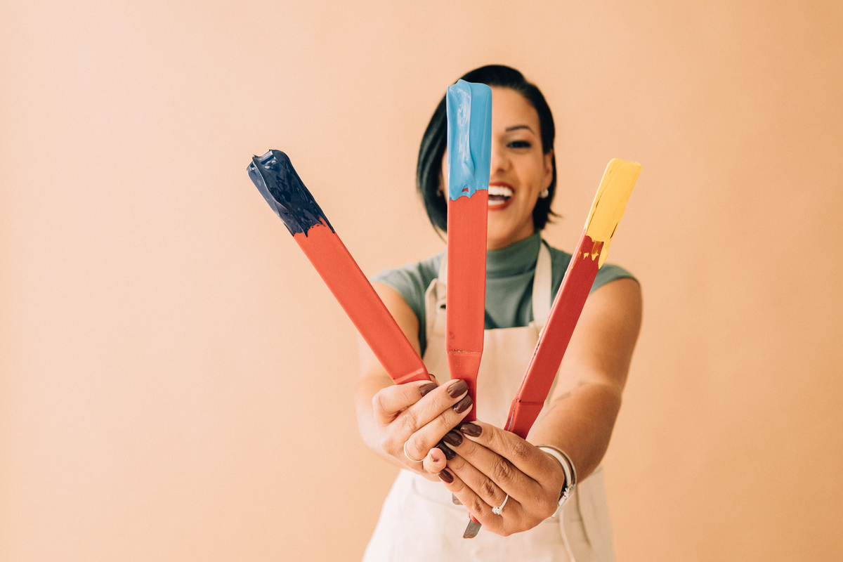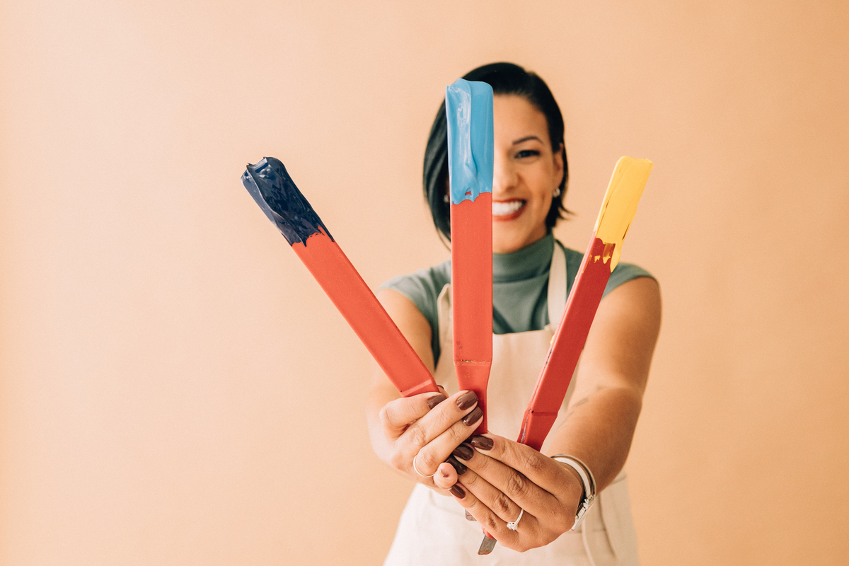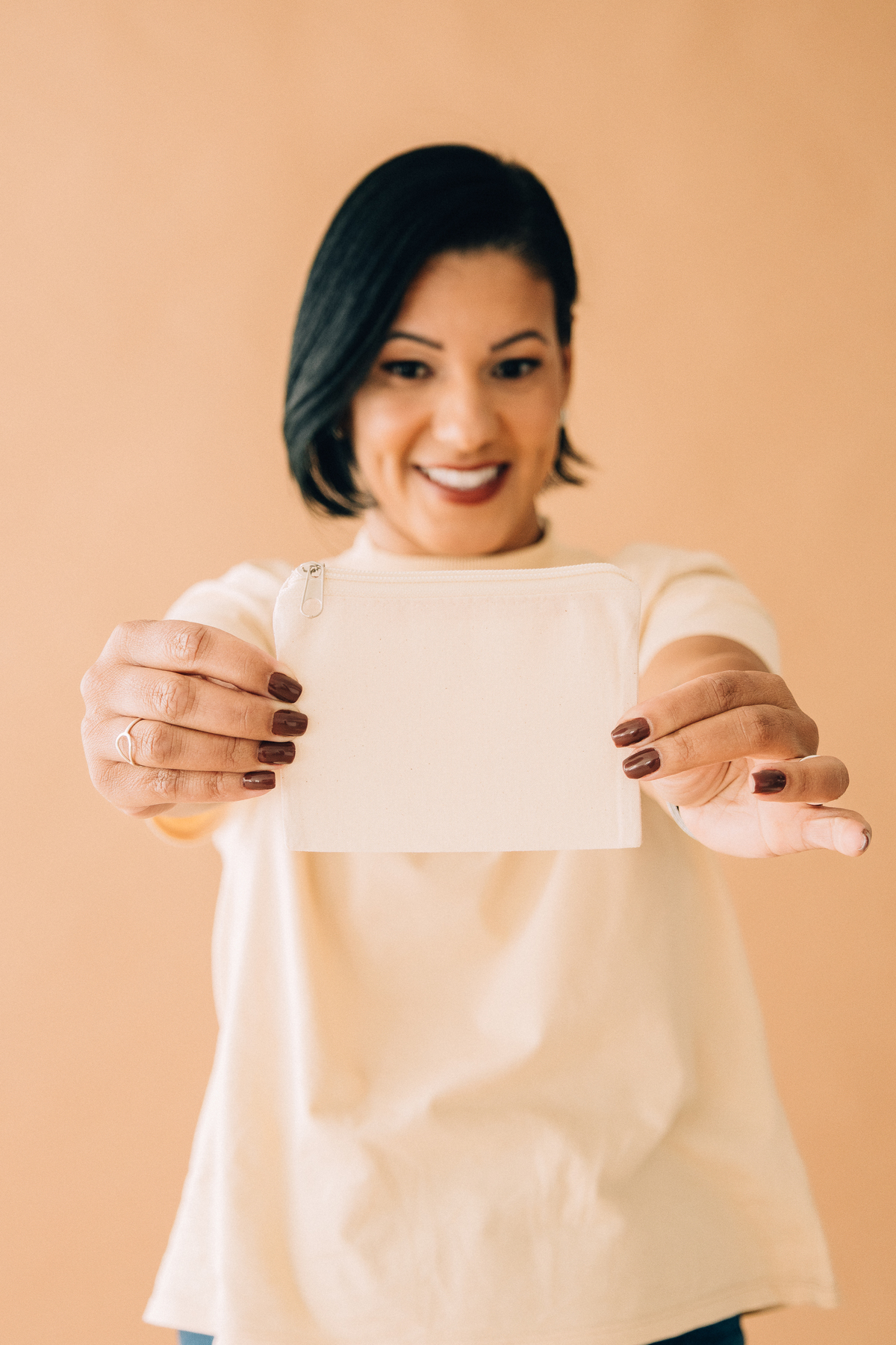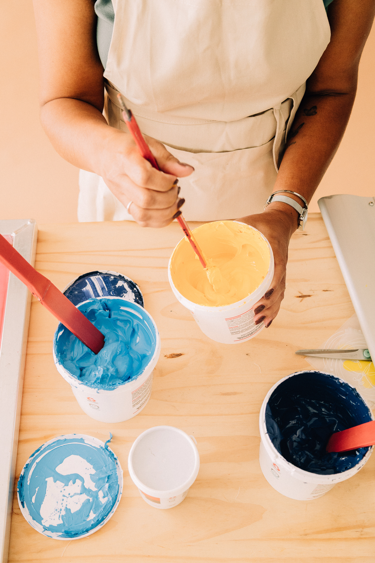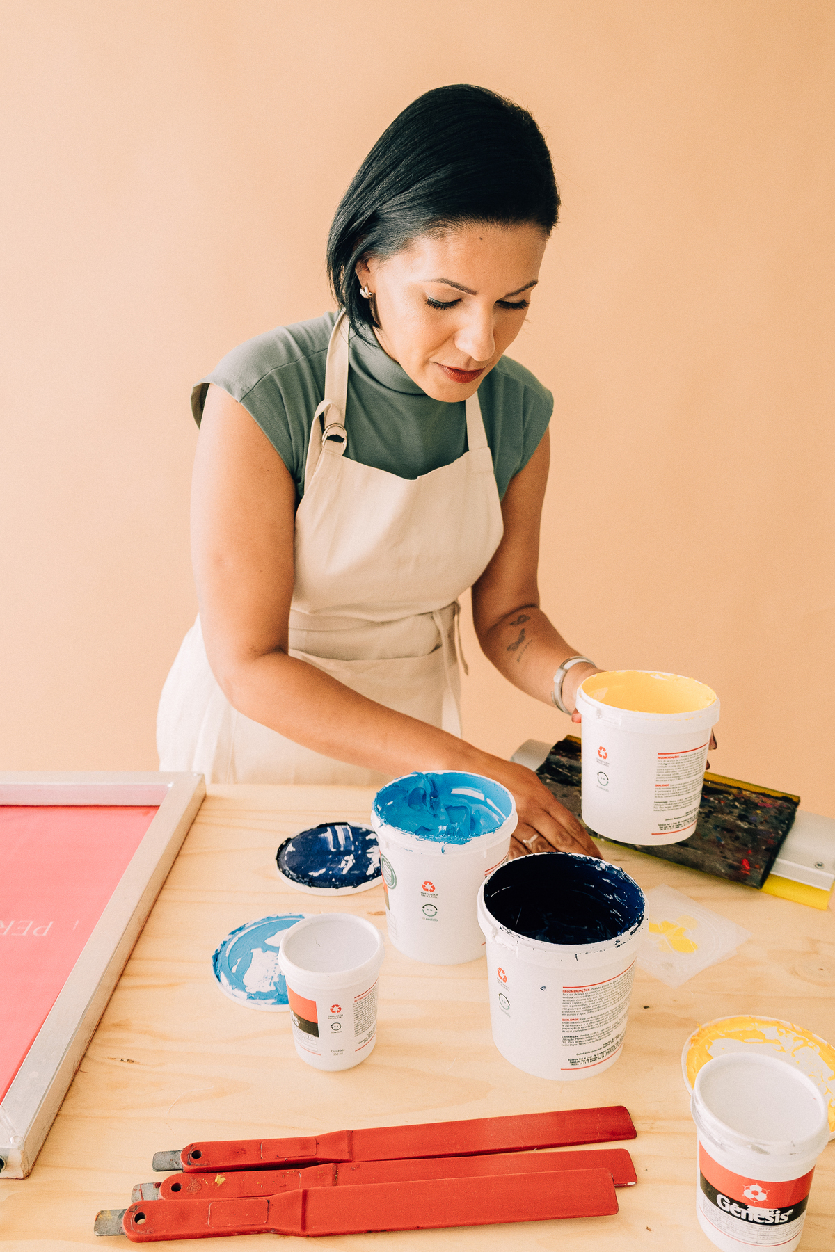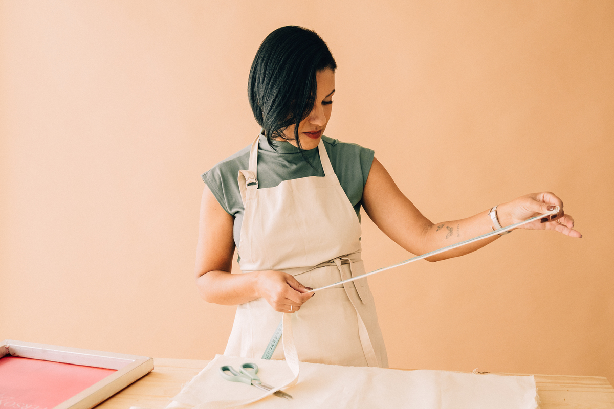 Ela queria um ensaio leve, sensível, com os elementos que fazem parte do seu dia a dia: o avental, os moldes, as fitas e os potes coloridos de tinta que espalham criatividade. Mas também queria que a doçura e a firmeza da sua personalidade estivessem ali, visíveis em cada imagem. E foi nesse desejo que surgiu um detalhe marcante: um galho de algodão que ela fez questão de trazer para o ensaio. Um símbolo simples, mas carregado de sentido — remetendo à sua escolha por um caminho sustentável, delicado e cheio de intenção.